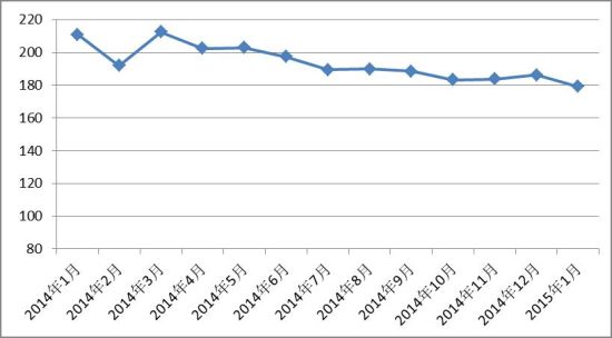 2015年1月,中国红木进口综合价格指数(HIPI)为179.2(见图I),同比下滑31.7%,环比下降6.9%。