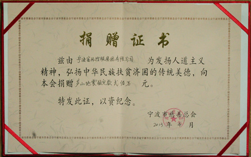 宁波富邦控股集团公司董事长、总裁、党委书记宋汉平委托集团公司副总裁、党委副书记谢松茂随即与宁波市慈善总会取得联系,及时将现金支票送达,成为宁波市首家到宁波市慈善总会捐款的企业,受到了市慈善总会领导的高度评价。富邦控股集团作为一家民营企业,以实际行动来帮助地震灾区人民共渡难关,体现了一家大企业大集团所承担的社会责任和人文情怀。