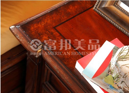 美式家具的鼻祖要追溯到欧洲文艺复兴后期各国移民所带来的生活方式,从许多18、19世纪世代相传下来的经典家具中,可以看出早期美国先民的开拓精神和崇尚自然的原则,家具造型典雅,又不过度装饰。 美式家具中酷爱做旧工艺,也是这种仿古情结导致。在原本光鲜的家具表面,故意留下刀刻点凿的痕迹,好像用过多年的感觉。涂抹的油漆也多为暗淡的哑光色,排斥亮面同样源于希望家具显得越旧越好。如果你拥有一件祖母用过的旧家具,一定要放在居室最醒目的位置,它是你注重文化和历史的象征。 破坏是美式家具在涂装过程中充分体现仿古效果的一道加工工序,它主要仿造风蚀、虫蛀、碰损以及人为破坏等留下的痕迹,可以塑造出历史延续的效果,这种基材破坏主要有如下几种,下面我们就以美式家具领导品牌——富邦美品家具为大家详细讲解。 特征一:虫孔 虫孔是模仿家具长时间存放后木材被虫蚀、虫蛀后留下的痕迹。一般来说虫蛀现象多见于家具的破坏朽烂处以及边缘部位。富邦美品—维帝品牌的这款床型边缘明显的虫蛀平添自然森林情调,彰显材质。